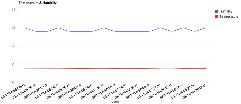 Finally, you are ready to test the project. Upload the code to the Arduino Yun board, open the Google Docs spreadsheet in your browser again, and wait a moment. After a while, the first measurement should appear: